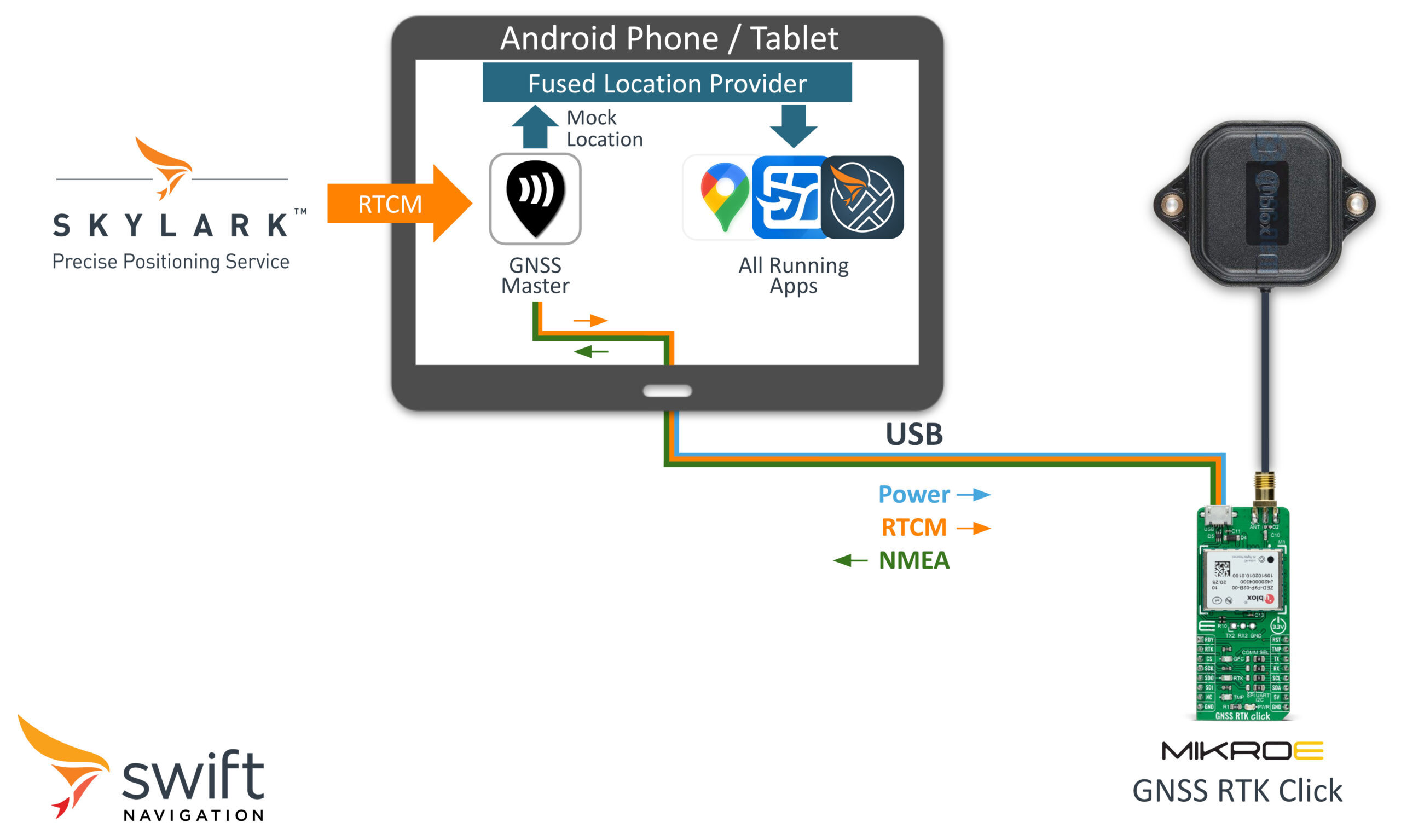 To deliver Skylark corrections to the Click Board, we’ll use GNSS Master — a free, lightweight Android app that supports USB-connected GNSS receivers.