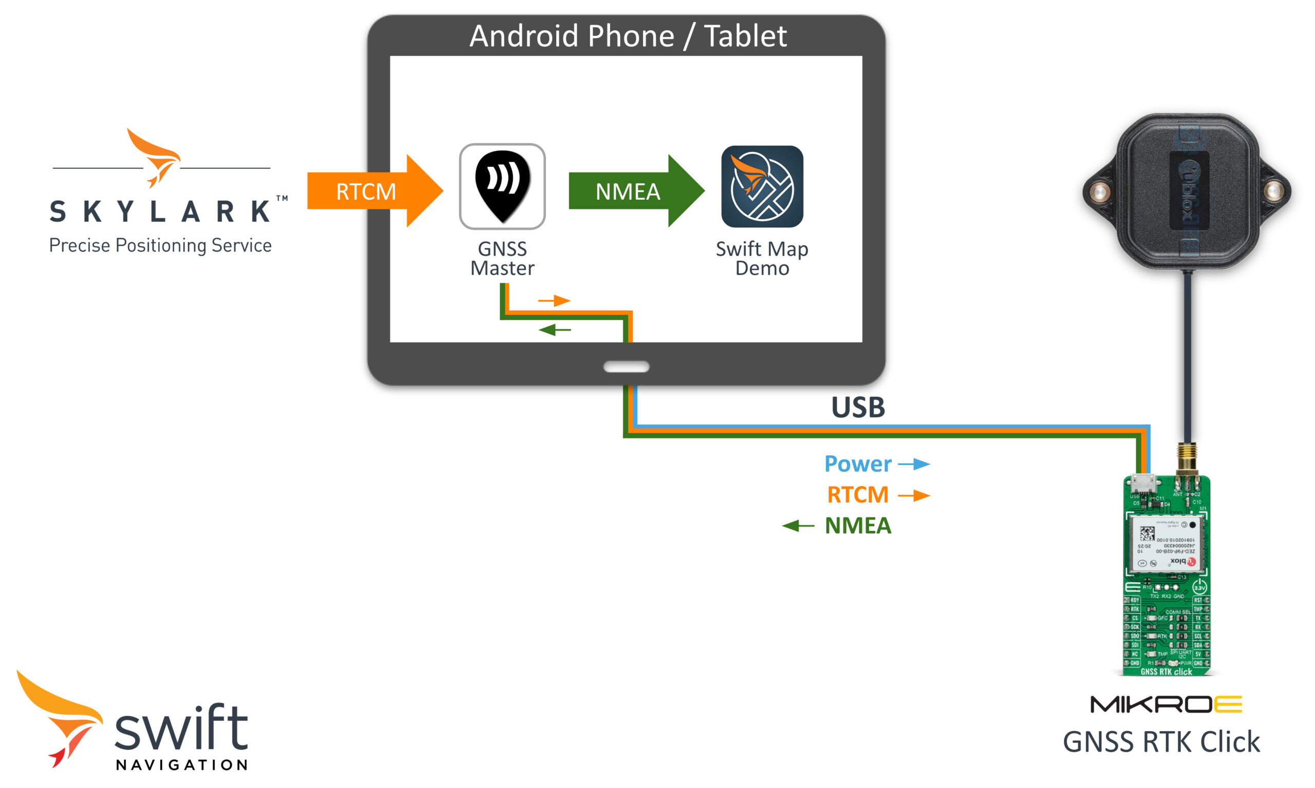 In this post, we’ll connect the MikroE GNSS RTK Click — powered by the u-blox ZED-F9P — to an Android tablet, stream Skylark™ RTK corrections into it, and visualize centimeter-level accuracy in real time using the Swift Map Demo app.